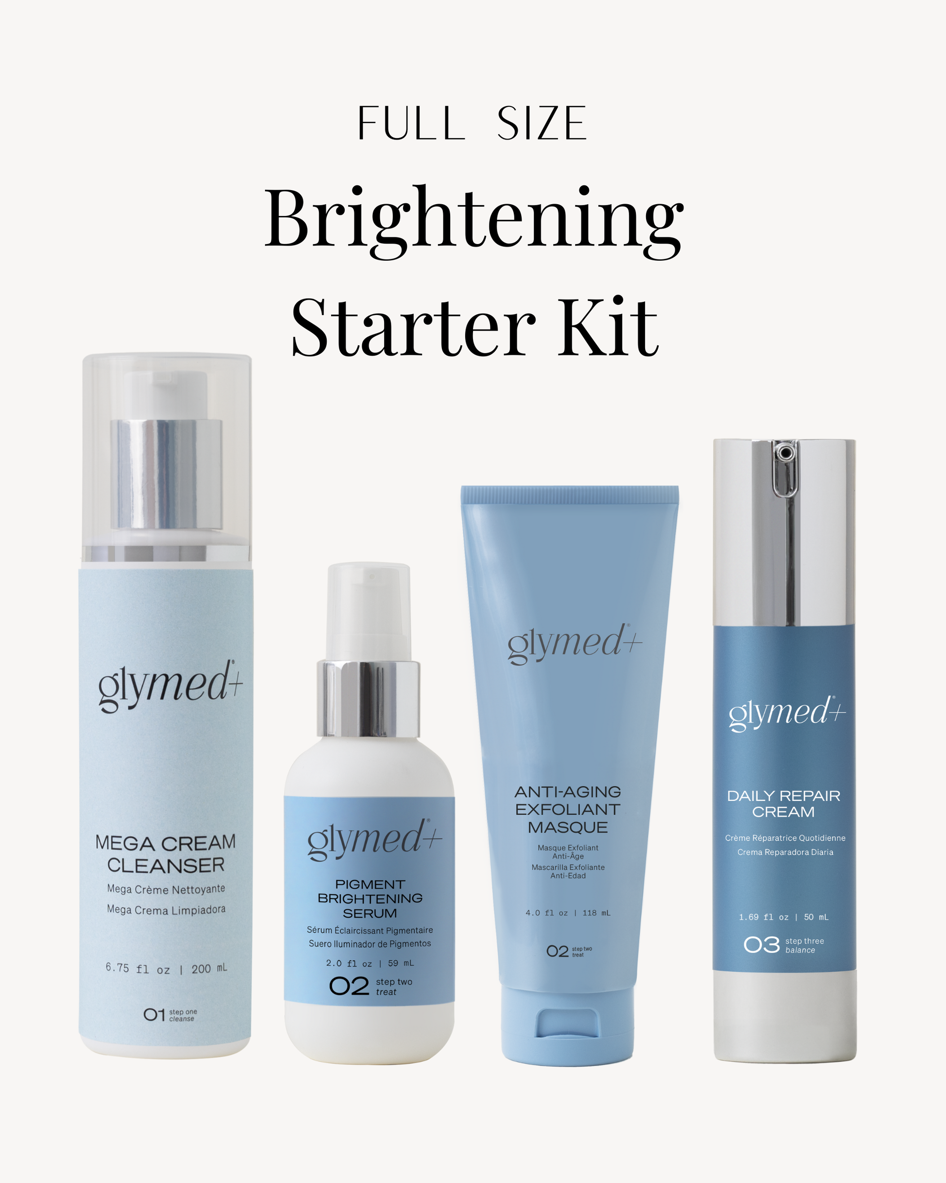 The Brightening Starter Kit is a curated 4-step routine designed to brighten the complexion, fade pigmentation, smooth texture, and restore a healthy, luminous glow.